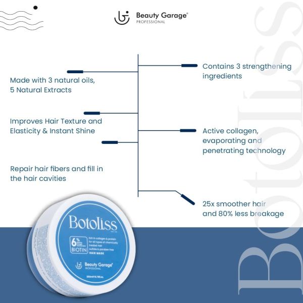 Treat yourself to salon-quality hair with the Beauty Garage Botoliss Biotin Mask (200 ml). This keratin hair mask repairs hair fibers and prevents split ends. It is a hair-strengthening mask that improves elasticity and fortifies brittle hair. The Beauty Garage hair mask is also a nourishing mask that reduces breakage and split ends.